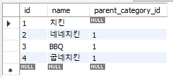 아래 코드로 부모 카테고리 하나와 자식 카테고리 세 개를 저장해보았다.
