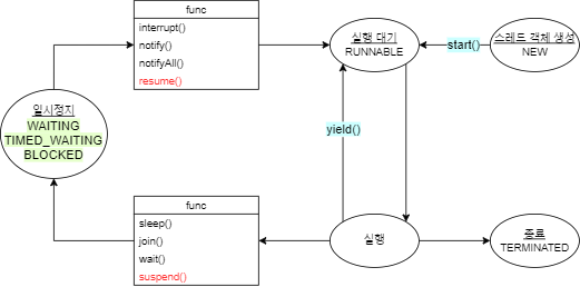 스레드의 상태 주기는 다음과 같다. 빨간색 표시는 Deprecated 된 메소드를 의미한다.