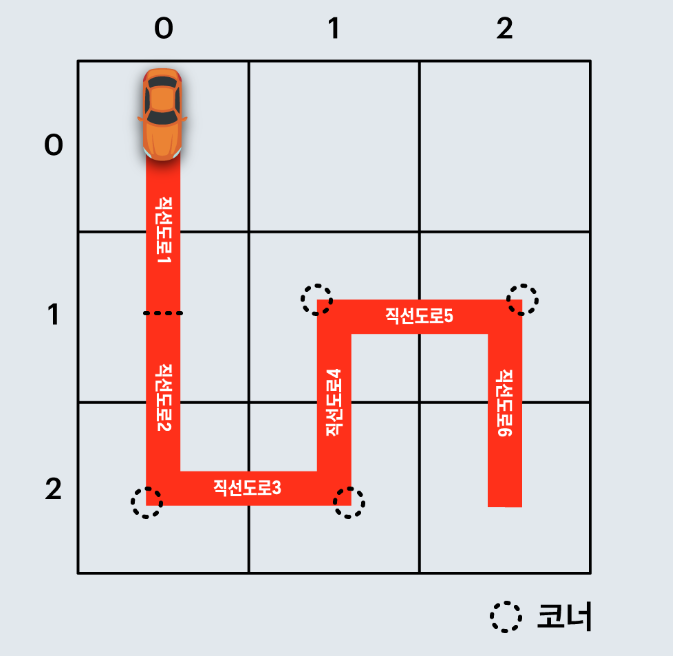 위 그림을 살펴보면 자동차가 직진하는 경우에는 직선도로 한 개가 필요하지만 다른 방향으로 꺾어서 진행하는 경우에는 코너와 직선도로가 모두 필요하다. 즉 직진인 경우에는 100원, 꺾는 경우에는 600원이 든다고 볼 수 있다. 이를 토대로 방향을 고려하여 금액을 누적시키면서 최단 거리를 구하면 된다.