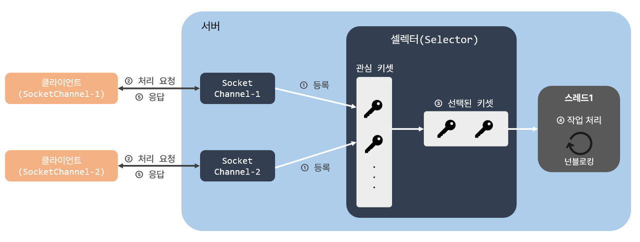 무한 루프 내부에서 대기하는 방식은 CPU에 부담이 될 수 있습니다. 그렇기 때문에 이를 셀렉터(Selector)를 통해서 극복할 수 있습니다. 셀렉터는 이벤트 리스너의 역할을 수행하는데, 예를 들어 클라이언트의 연결 요청이 들어오면 채널은 셀렉터에 이를 통보하고 셀렉터는 해당 채널들의 논블로킹 메소드를 수행하여 작업을 처리하도록 합니다.