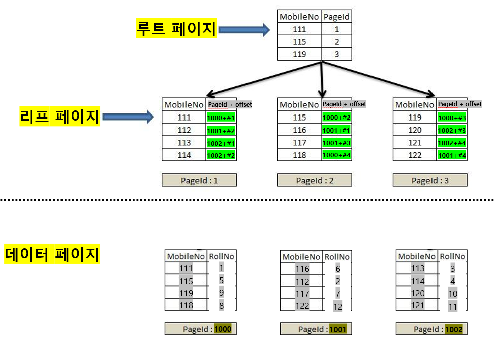 보시면 이번에는 MobileNo 컬럼이 인덱스로 설정된 것을 볼 수 있습니다. PageId를 따라가시면 리프 페이지에서 다시 PageId+offset을 확인하실 수 있습니다. offset은 페이지에서의 행 번호라고 보시면 될 것 같습니다. 예를 들어 1000 + #1 이라는 것은 1000번 페이지에 첫 번째 행을 의미합니다.