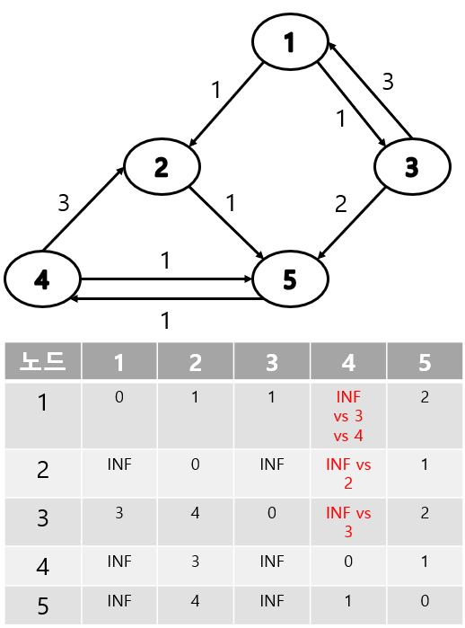 이제 1을 거치지 않는 경로와 1을 거쳐가는 경로의 비용을 비교해서 인접 행렬을 갱신해준다.