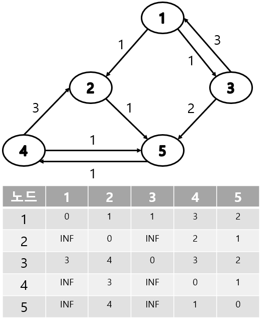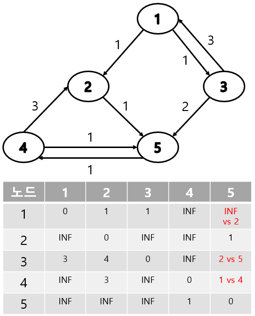 이제 1을 거치지 않는 경로와 1을 거쳐가는 경로의 비용을 비교해서 인접 행렬을 갱신해준다.