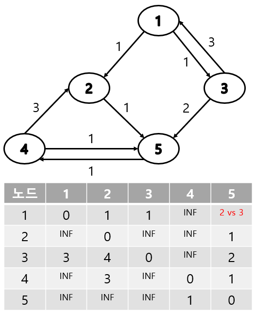 다음으로 2를 거치지 않는 경로와 2를 거쳐가는 경로의 비용을 비교해서 갱신한다.