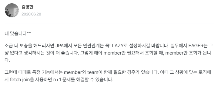 이렇게 단순히 JOIN으로는 JPQL에서 N + 1 문제를 해결할 수 없음을 보았다. 그래서 left join과 같은 방식으로 가져오면 안 될까?라고 생각했는데 left join으로 해당 결괏값을 담을 수 있는 Dto를 따로 정의하여 가져오는 방법이 있었다. (이 방법은 다음에 포스팅하도록.. 궁금하면 링크 참조 https://jojoldu.tistory.com/342 )
