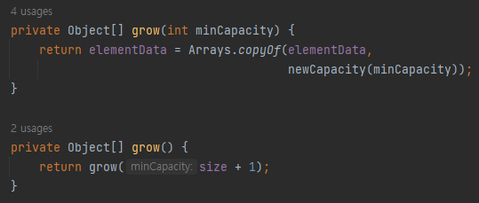 이제 grow() 함수를 살펴보면 아래와 같이 두 개의 grow() 함수가 오버로드 되어 있다. 두 번째 grow()는 보통 add()에서 호출하고 첫 번째 grow()는 보통 addAll()에서 호출한다. 그런데 두 번째 grow() 함수는 단순히 첫 번째 grow() 함수를 재호출하므로 첫 번째 grow() 함수만 살펴보면 된다.