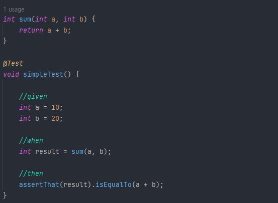 given에서 테스트를 준비하고, when에서 검증하고자 하는 메서드를 호출하고, then에서 호출 결과를 검증한다. 너무나 간단하기 때문에 더 설명할 것도 없다.