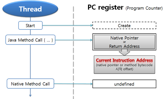 Thread가 생성될 때마다 생성되는 영역으로 프로그램 카운터, 즉 현재 스레드가 실행되는 부분의 주소와 명령을 저장하고 있는 영역이다. CPU 내부에 Program Counter 역할과 비슷해보인다.