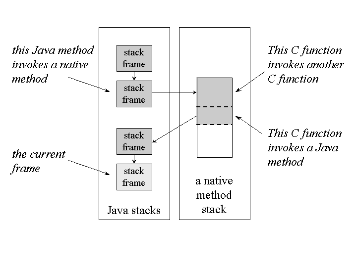 우선 이 영역은 가장 흔히 사용되는 Hotspot JVM, IBM JVM 에서 따로 구분 짓지 않고 있다. 개념적으로 분리된 공간이라고 보는 것이며 단지 Java Method를 수행하는 것이냐 Native Method를 수행하는 것이냐를 따져 프레임이 기본 Java Stack Frame인지 아니면 Native Stack Frame인지를 구분할 뿐이라고 한다. 즉 모든 프레임은 JVM Stack 내에 함께 저장되고 Native Method를 수행하는 경우 Java Stack Frame에서 Native Stack Frame으로 작업이 전환된다고 보는 것이 좋을 것 같다.