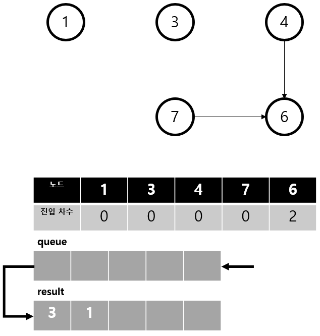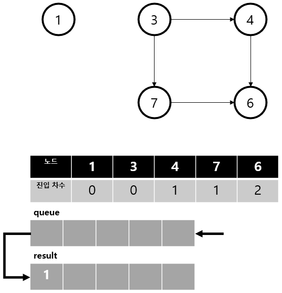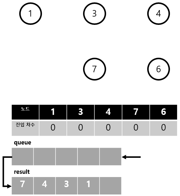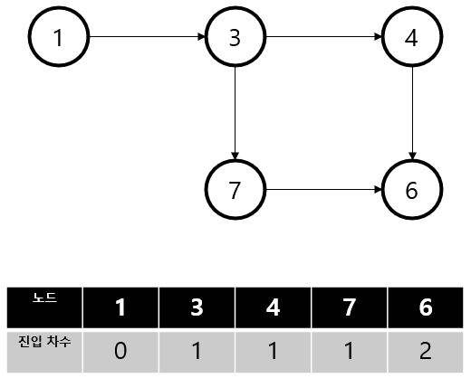 - 진입 차수가 0인 노드를 큐에 삽입한다.