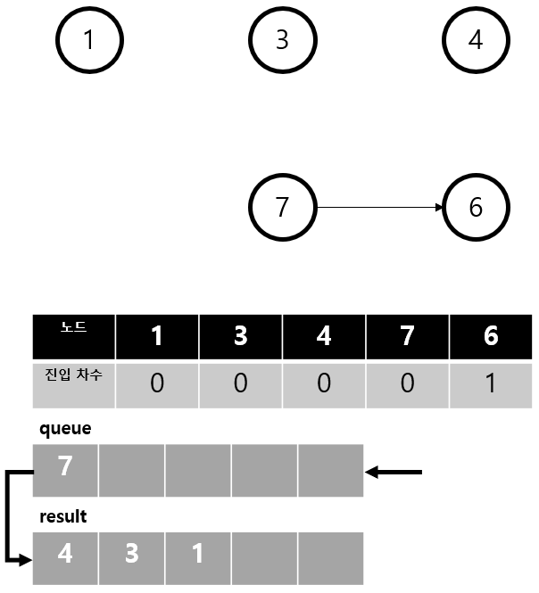 이제 4번, 7번 노드의 진입 차수가 0이 되었다. 4번, 7번 노드를 큐에 삽입하고 4번 노드를 꺼내서 간선을 제거한다.