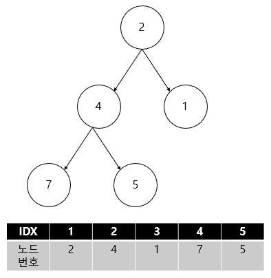 그럼 이제 완전 이진 트리에 대해서 힙 정렬을 수행해보자. 완전 이진 트리를 표현하는 가장 간단한 방법은 배열에 그대로 노드를 삽입하는 것이다. 예를 들어 트리가 다음과 같다면 배열로 다음과 같이 표현할 수 있다.