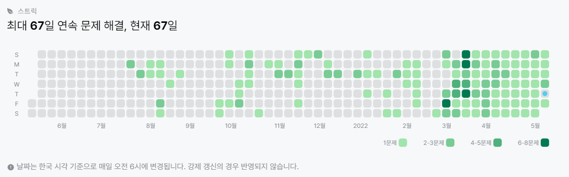 즉, 하루에 한 문제 풀어서는 큰 발전을 기대할 수 없다. 단지 자신의 성실함을 테스트해 볼 수 있다는 점, 아예 손을 놓은 것에 비해서 감을 놓치지 않을 수 있다는 장점이 있다.