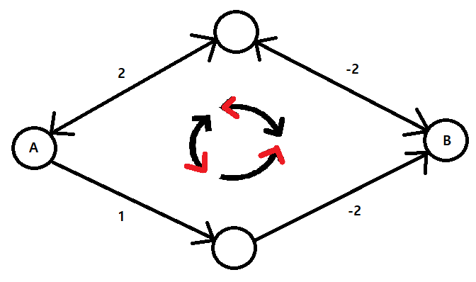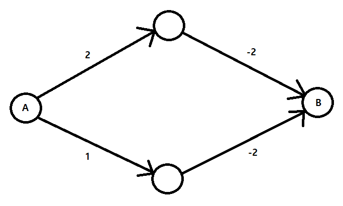 위에 그래프는 단방향의 간선을 가지고 A->B로 가는 경로가 두 가지가 있다. 그래프를 대충 봐도 우리는 당연하게 A->B로 가는 최단 거리가 -1 임을 알 수 있다. 다익스트라도 이 상황에서는 최단 경로를 구할 수 있고, 결국 그래프에 음수 간선이 있더라도 다익스트라로 무조건 풀 수 없는 건 아니라는 뜻이다.